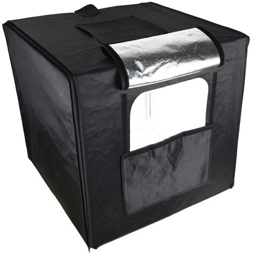 Ideal for shooting small objects the 15.7 x 15.7 x 15.7″ LSD40 Light Tent from Godox surrounds your subject with light from two dimmable LED strips with diffusers that are optimized with the tent’s silver interior. The tent has two shooting ports (front and top) for cameras.