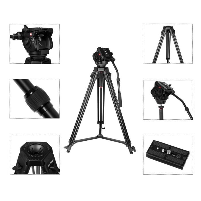 Professional camera video tripod with detachable pan tilt fluid head, ideal for video shooting, live broadcasting and photography.