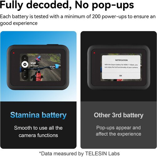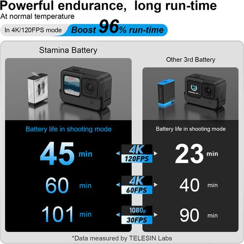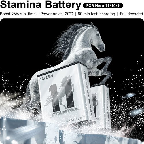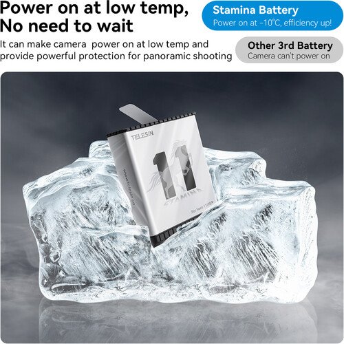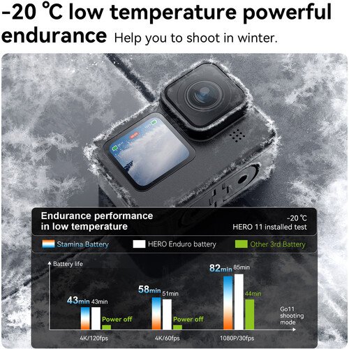 Start up and keep your HERO11, HERO10, or HERO9 Black action camera running even in frigid conditions with the High-Performance Stamina Battery from TELESIN. This battery features a 1720mAh capacity, can be used at temperatures down to 4°F, and provides up to a 96% performance boost for 4K120 capture at normal temperatures.