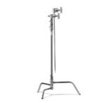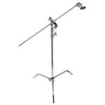 This 10.75′ Impact Turtle Base C-Stand Kit, in a chrome finish, is comprised of a C-stand, 2.5″ grip head, and 40″ extension arm. The stand features a patented locking mechanism that allows the legs to swing out and lock into place for easy setup and collapse flat for storage. The included extension grip arm fits neatly into the stand’s removable 2.5″ grip head, allowing you to offset the stand and cantilever flags, gobos, or lights out of the way of the action. The stand has a low center of gravity which allows mounting of heavy equipment without tipping. The legs are perfectly shaped for saddlebag-type sandbags. The kit is also often used as a short boom.